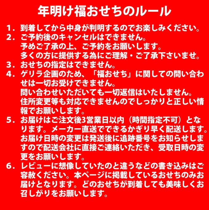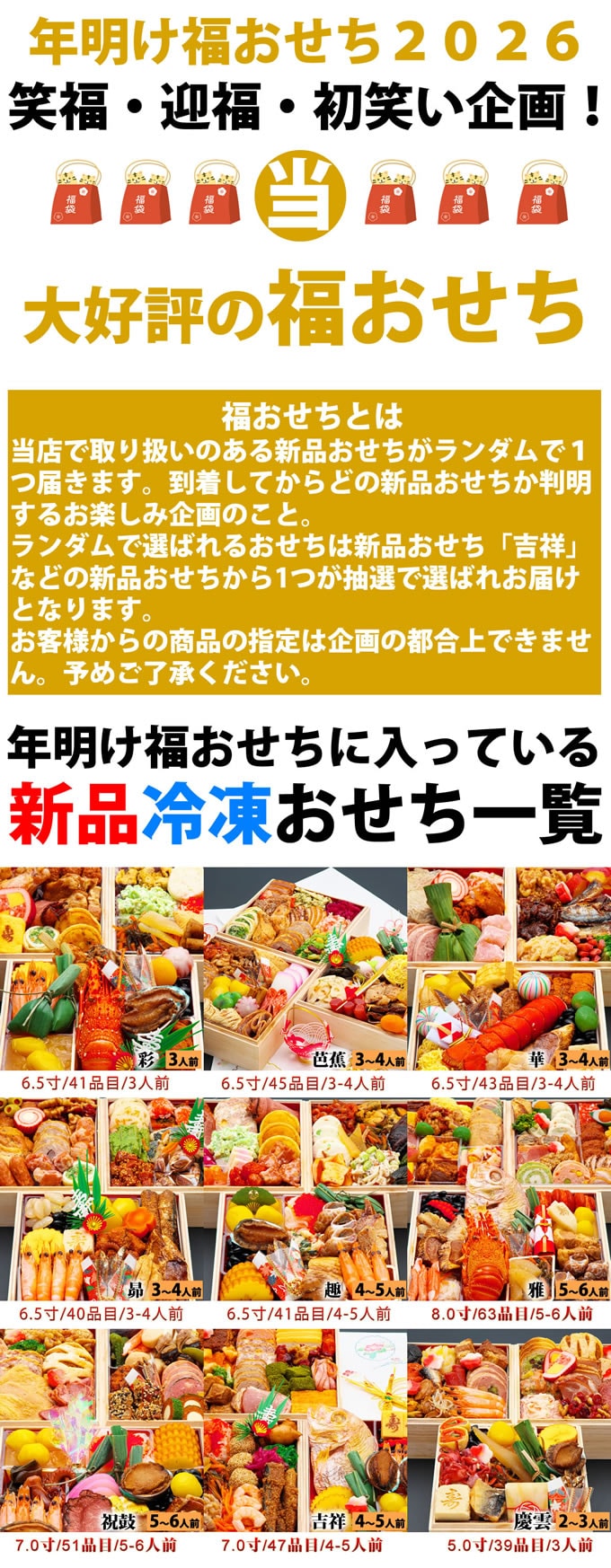 ・注意事項:福おせちは掲載している9種類のおせちから抽選で1種類のおせちをお届けします。到着までどのおせちが届くかワクワクどきどきするおせちの企画です。企画内容をご理解の上、ご予約をお願いします。
