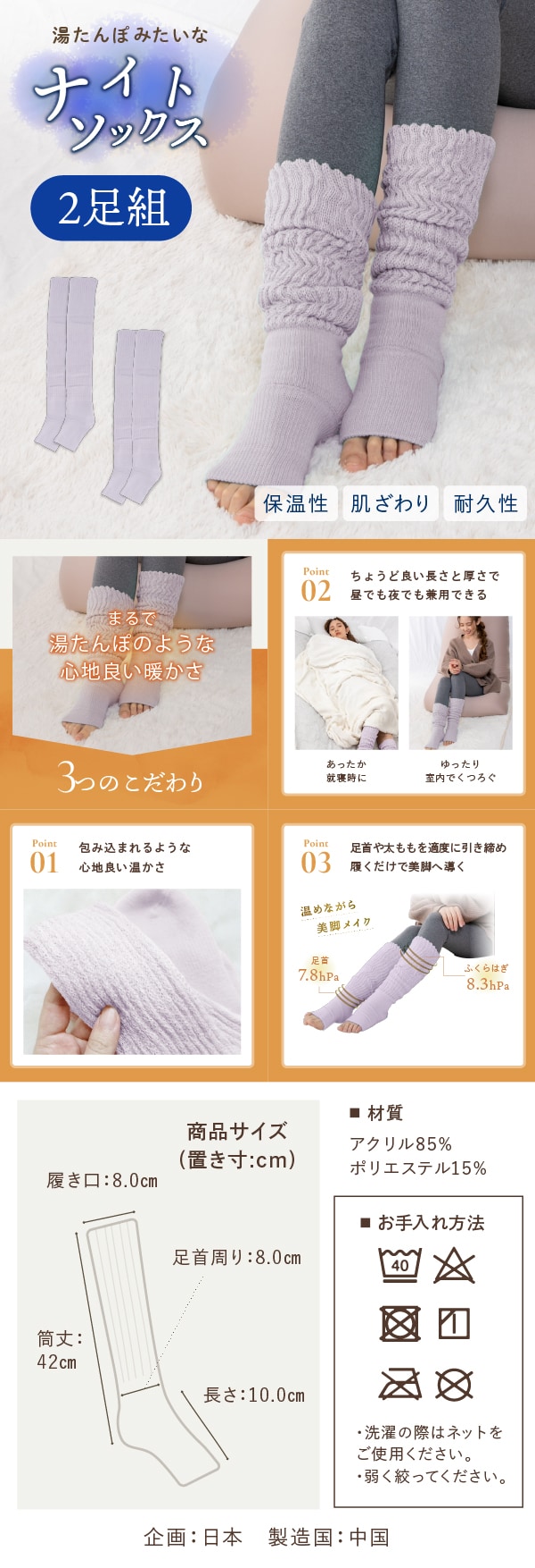 - 【ライラック/2足組】湯たんぽみたいなあったかナイトソックス