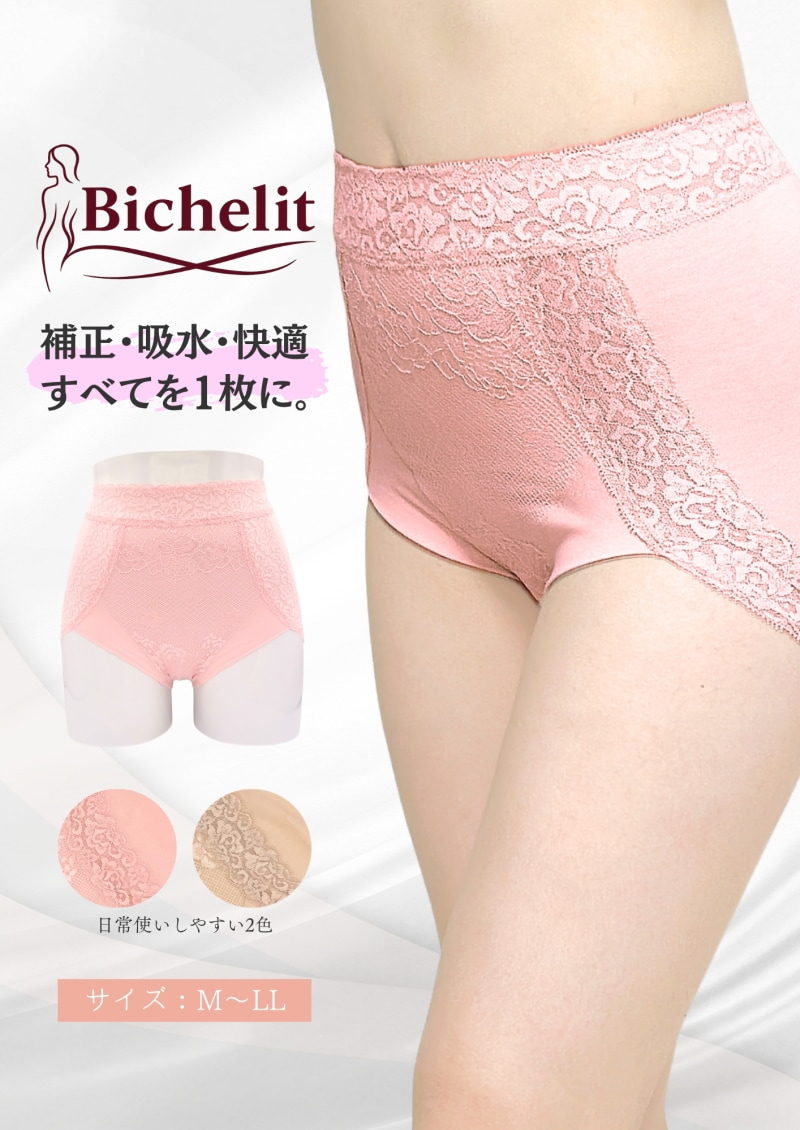 【ベージュ/LLサイズ/2枚セット】ビューティケアサポート&ショーツ Bichelit | レースなのに、ぽっこりお腹もお尻も補正!うっかり漏れも吸水!サニタリーとしても◎!