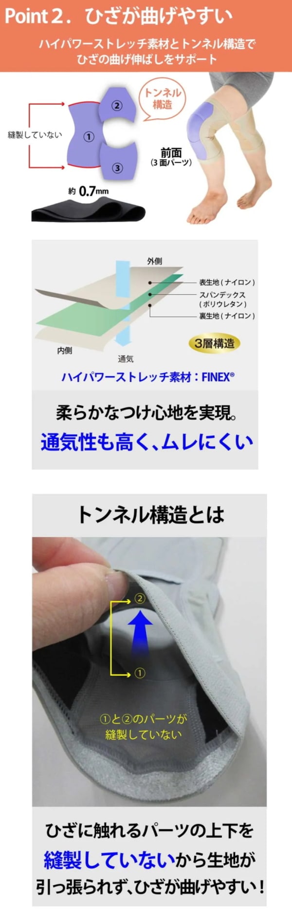 ひざ部分は上下を縫製しないトンネル構造なので、動きやすく、ぐんぐん歩けます。