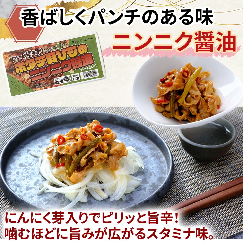 ホタテ貝ひものニンニク醬油 :ほたてひも(宮城県産)、たれ(食用植物油脂、しょうゆ、ごま、おろしにんにく、ラー油、砂糖、食塩、醸造酢、発酵調味料)、にんにくの芽、唐辛子/調味料(ア ミノ酸等)、増粘剤(加工デンプ ン、キサンタン)、酸味料、香辛料抽出物、(一部に小麦・ごま・ 大豆を含む)