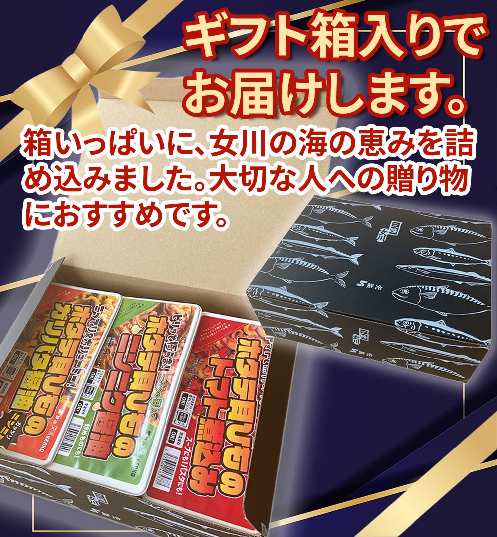 ・その他商品仕様:宮城県産ホタテ貝ひもを美味しくアップサイクルした、やみつきの味わいが魅力の3種食べ比べセットです。おつまみやご飯のおかずにぴったりで、お酒が進む一品。そのままはもちろん、電子レンジで温めても美味しくお召し上がりいただけます。さらに炒飯やパスタの具材などアレンジ料理にも使え、料理の幅が広がります。常温で長期保存が可能なため、ご家庭の常備品やアウトドアシーンにもおすすめです。ギフト箱入りなので、お贈り物にもご利用頂けます。