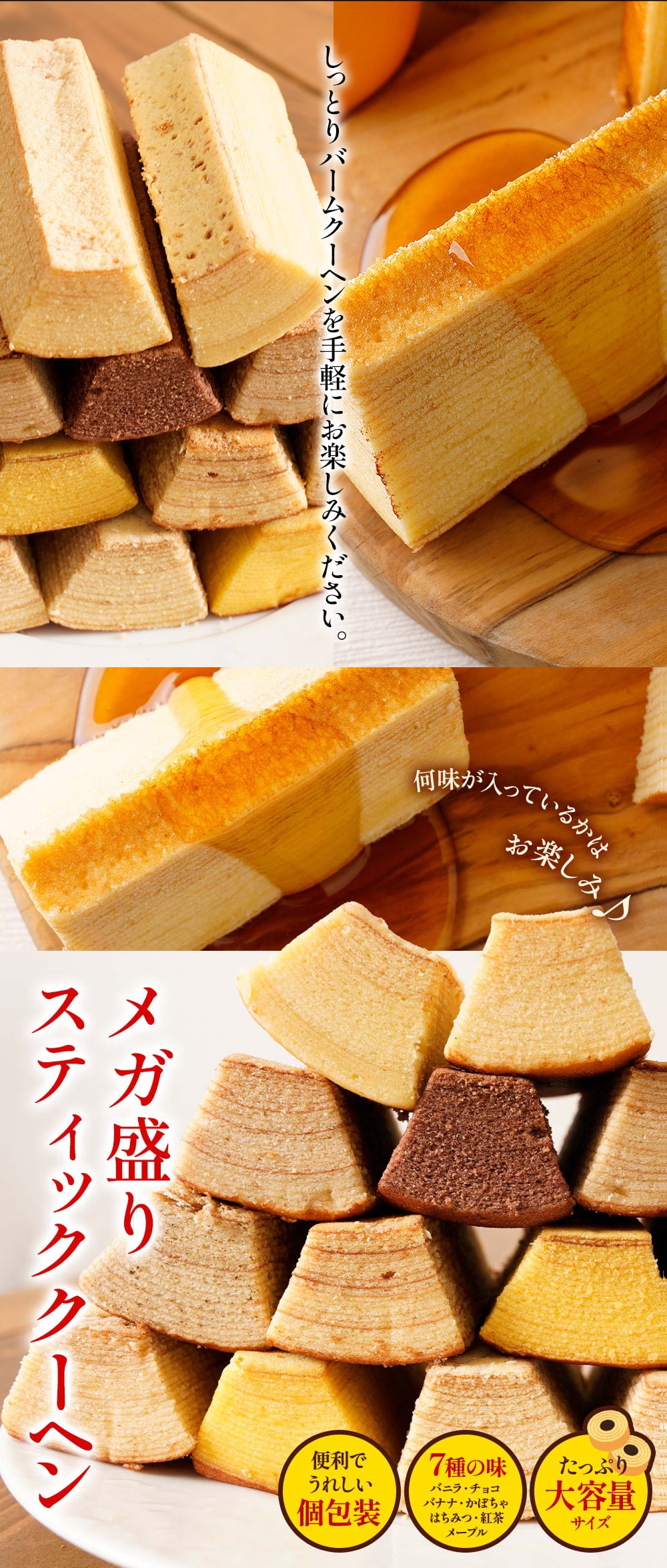 - おもいきり食べられる下町バームクーヘンの秘伝のレシピで焼き上げたしっとりスティッククーヘン!
