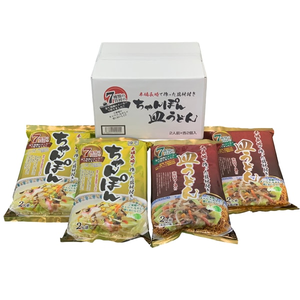 - 7種の具材本場長崎で作ったちゃんぽん2食(麺140gx2 具材40gx2 液体スープ35.2gx2)x2、7種の具材本場長崎で作った皿うどん2食(具材280g 揚げ麺80g ウスターソース5.9gx2)×2