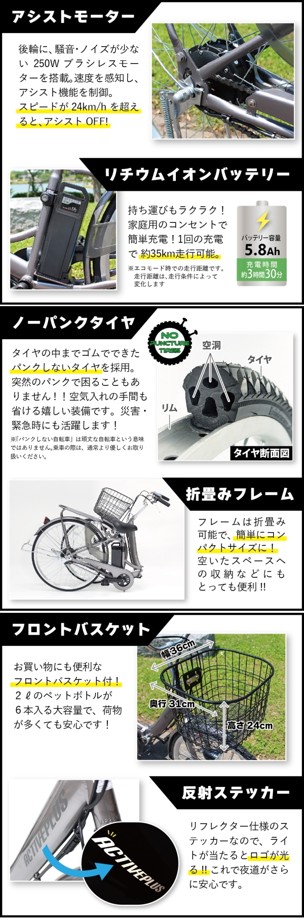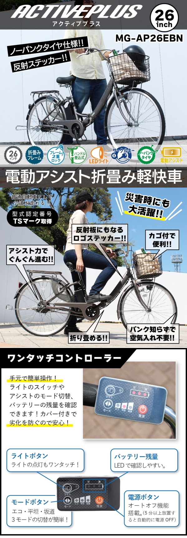 ACTIVEPLUS 26インチノーパンク折畳電動アシスト軽快車 | パンクしない!空気入れ不要の電動アシスト自転車!買い物などの足に!坂道らくらく♪