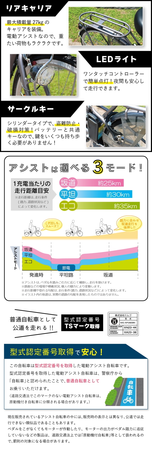この自転車は道路交通法令に定められた基準に適合したことを明らかにする国家公安委員会の型式認定を取得しており型式認定済みTSマークを添付しています。 ※工場出荷時に添付されているTSマークには保険は付帯されていません