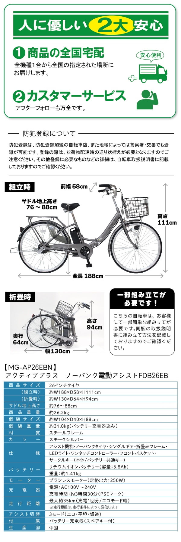 ・使用方法:仕様:アシスト機能・ノーパンクタイヤ・折畳みフレーム・シングルギア・LEDライト・ワンタッチコントローラー・フロントバスケット・サークルキー(本体/バッテリー共通キー)