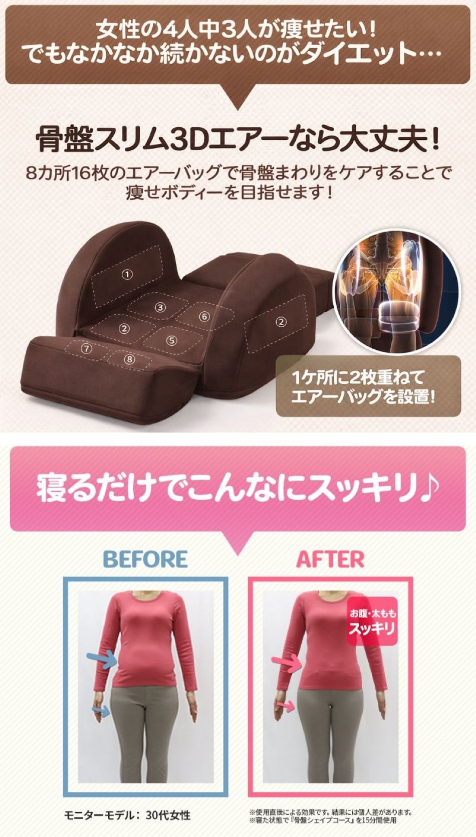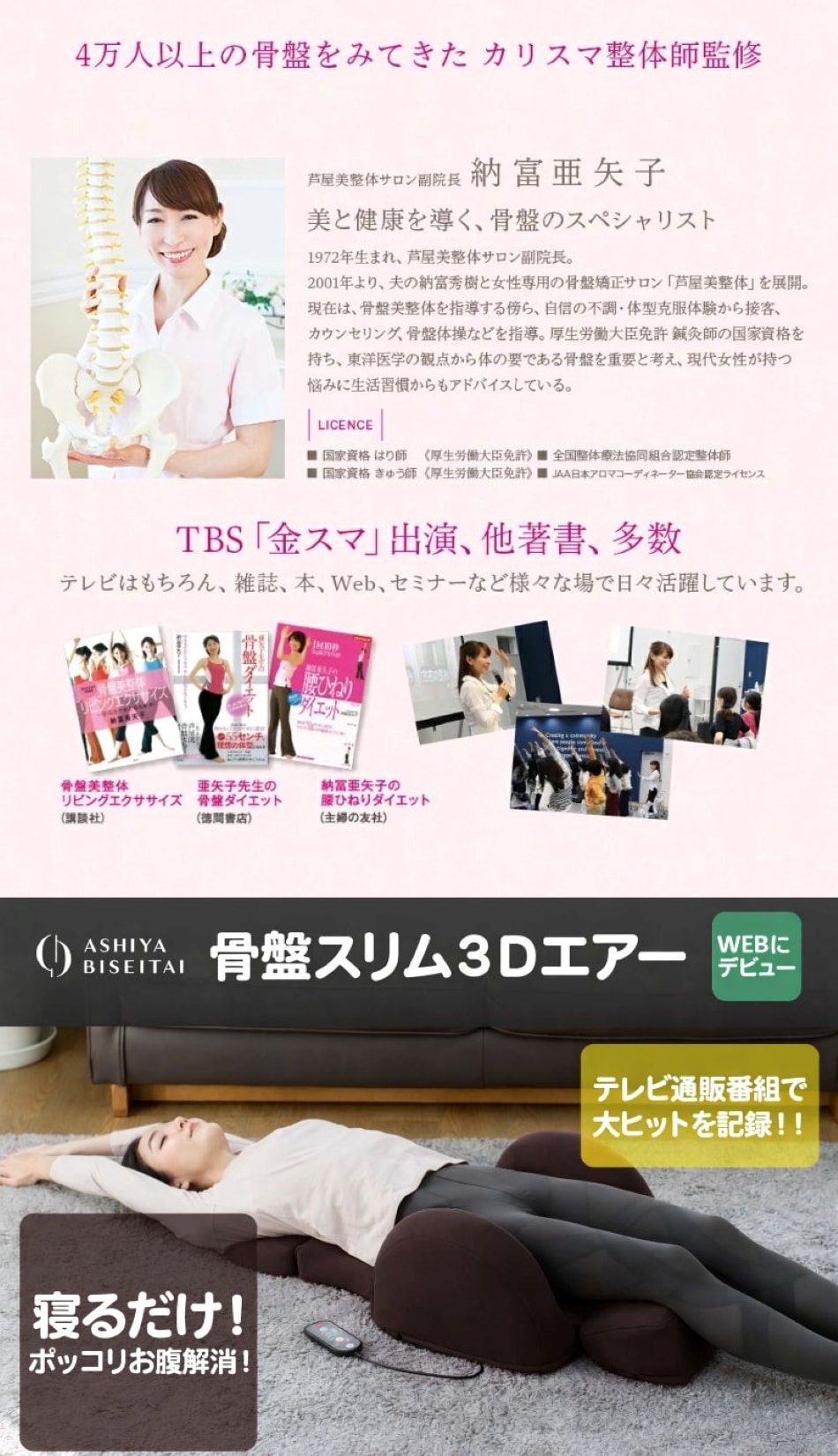 人気骨盤矯正サロン・芦屋美整体の納富亜矢子先生監修。芦屋美整体の施術をご自宅で再現できる「骨盤スリム3Dエアー」は骨盤周り、お尻、太ももにそれぞれ立体的に動くエアーバッグを搭載し心地よくボディーシェイプしてくれる新感覚骨盤ケア商品です。