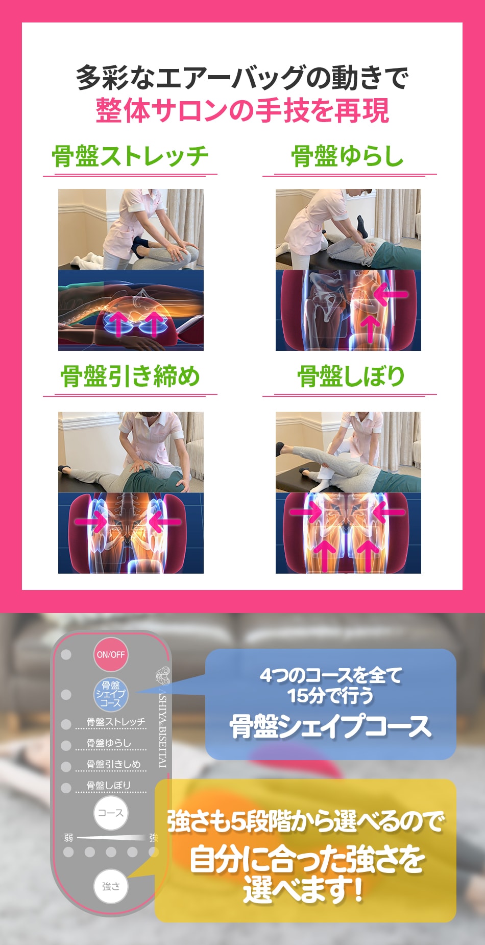 芦屋美整体 骨盤スリム3Dエアー | 骨盤周り、お尻、太ももにそれぞれ立体的に動くエアーバッグを搭載し心地よくボディーシェイプ!