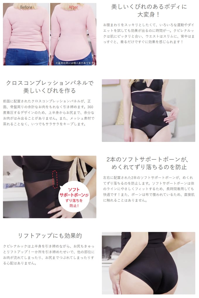 クビレナルックは、前面に配置されているクロスコンプレッションパネルで、正面、骨盤周りの余計なお肉をもれなく引き締め、美しいくびれを作ります。360度着圧デザインで、上半身を包み込むよう全方向から補正されているのに、楽な着心地!左右に配置された2本のソフトサポートボーンが、めくれてずり落ちるのを防止します。体形崩れが気になる方やダイエットに苦労している方必見!ボディラインを綺麗に見せ、大事な場面に自信のある姿で臨んでみませんか。