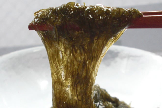 アルギン酸やフコイダンを含んだ水溶性の食物繊維です。昆布から出たとろとろは手で引っ張っても切れないほどです!