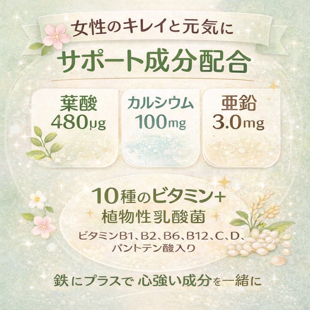 鉄 8.0mg、葉酸 480?g、カルシウム 100mg、亜鉛 3.0mg、パントテン酸 1.0mg、ビタミンB1 0.5mg、ビタミンB2 0.9mg、ビタミンB6 0.5mg、ビタミンB12 1.0?g、ビタミンC 10mg、ビタミンD 5.0?g、植物性乳酸菌(殺菌)2億個