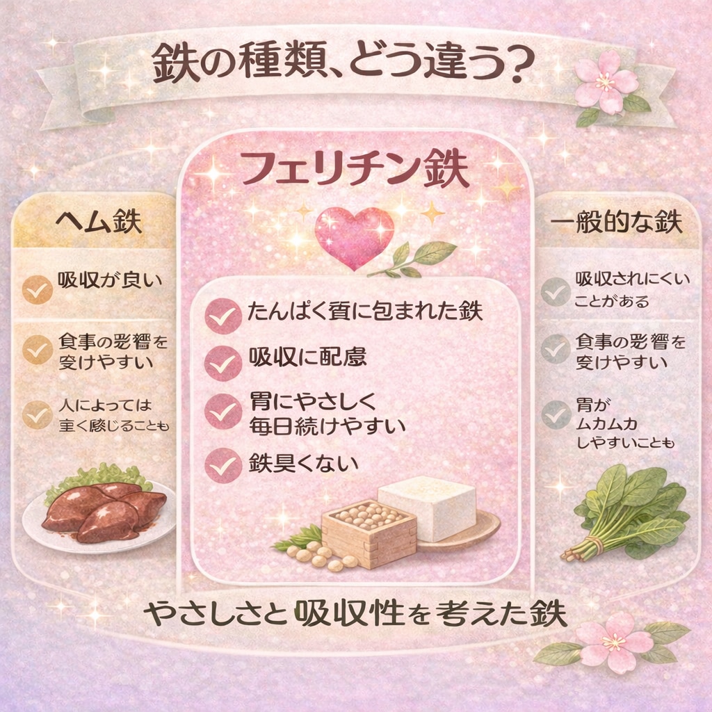 「フェリチン鉄+葉酸 60粒 ×6個セット (合計120日分) 」は、たんぱく質に包まれたやさしい鉄です。非ヘム鉄でありながら吸収に配慮されており、胃への負担が少なく、毎日続けやすいのが特長です。1日目安3粒で鉄8.0mgを補給でき、葉酸をはじめ、ビタミンB群、カルシウム、亜鉛、植物性乳酸菌など、女性にうれしい成分をバランスよく配合。食事だけでは不足しがちな鉄と栄養を、無理なく補いたい方におすすめです。