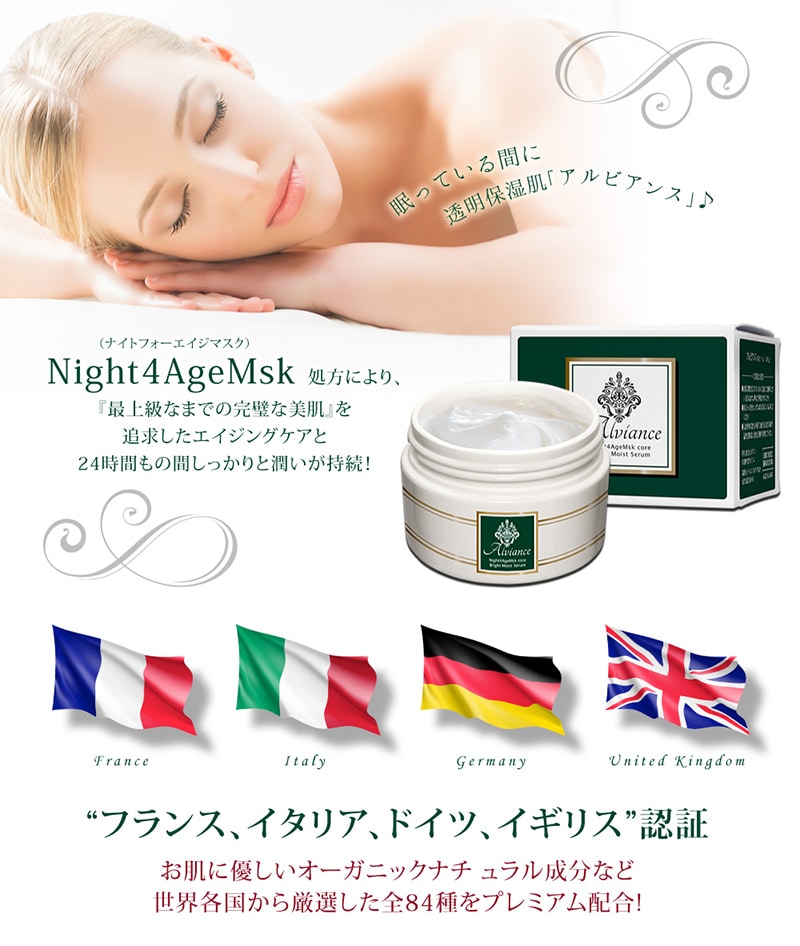 希少成分が寝ている間にグングン肌に浸透しハリ・弾力・潤いに満ちた美肌に導きます。