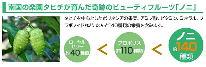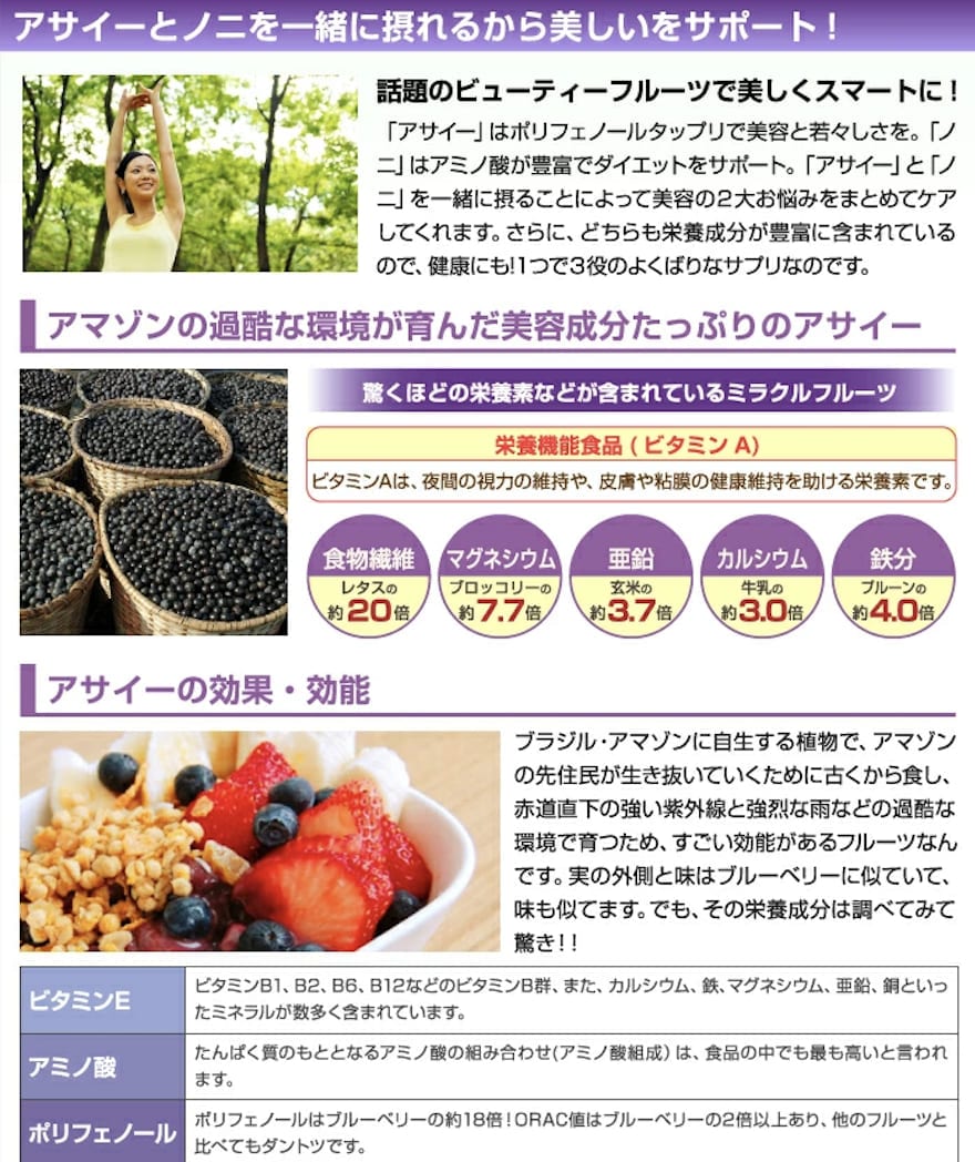 デキストリン、アサイーベリー果汁末、ブルーベリー果汁末、澱粉加水分解物、ノニ葉末、セルロース、ビタミンA、ショ糖脂肪