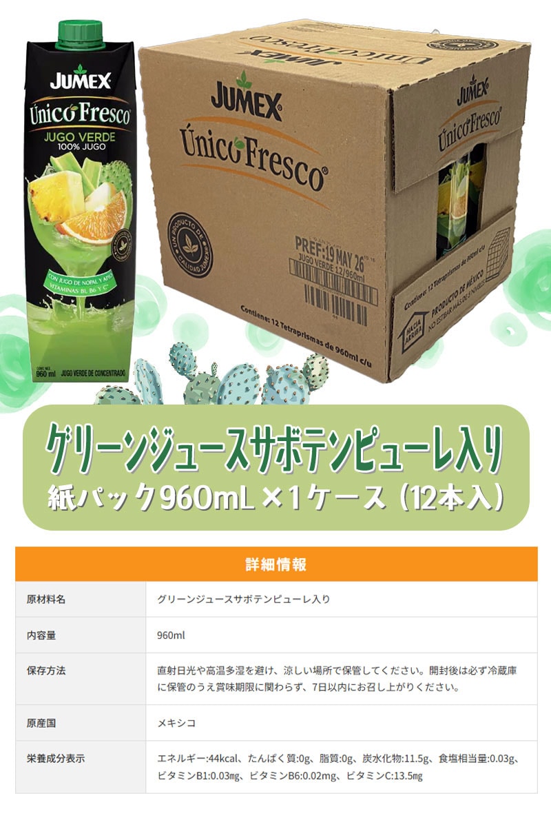 - JUMEX グリーンジュース・サボテンピューレ入り/960ml(1ケース・12本入り)