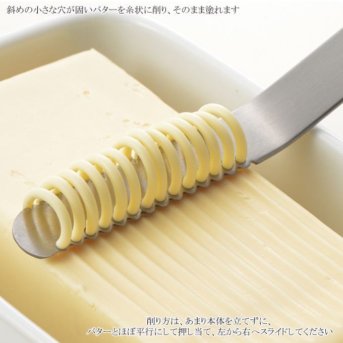 斜めの小さな穴が固いバターを糸状に削り、そのまま塗れます。