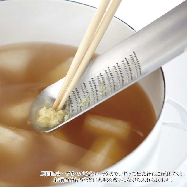 周囲にカーブをつけたトレー形状で、すって出た汁はこぼれにくく、お鍋の汁ものなどに薬味を溶かしながら入れられます。