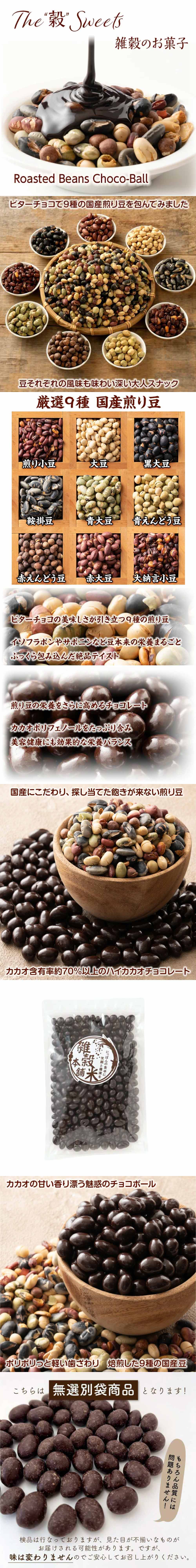 ・原材料/材質/素材:チョコレート[国内製造(カカオマス、砂糖、ココアバター、その他)]、国産煎り豆ミックス(黄大豆、青大豆、小豆、黒大豆、鞍掛け豆、赤えんどう豆、赤大豆、大納言小豆、青えんどう豆)、でん粉分解物/光沢剤、乳化剤、香料、(一部に乳成分・大豆を含む)