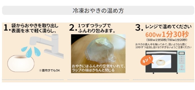 ・電子レンジの場合:冷凍おやきを水でぬらし、ラップをかけて1個の場合、600Wで1分30秒程度温めてください。