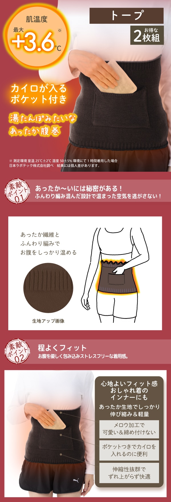 - 【トープ/2枚組】湯たんぽみたいなあったかポケット付き腹巻