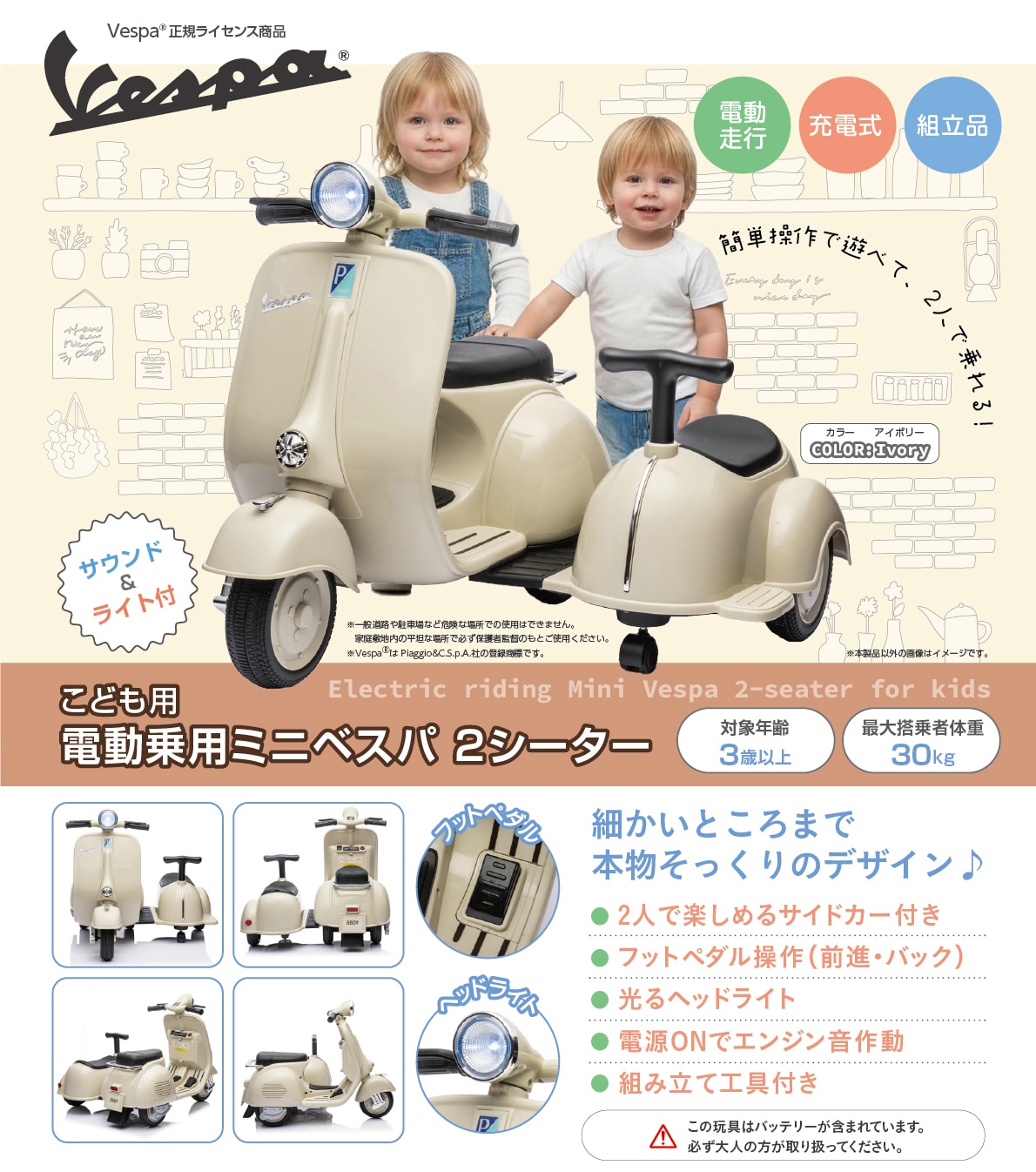【日替わり数量限定】こども用電動乗用玩具 ミニベスパ2シーター | ミニベスパに2人で乗れるサイドカーが付いて登場!