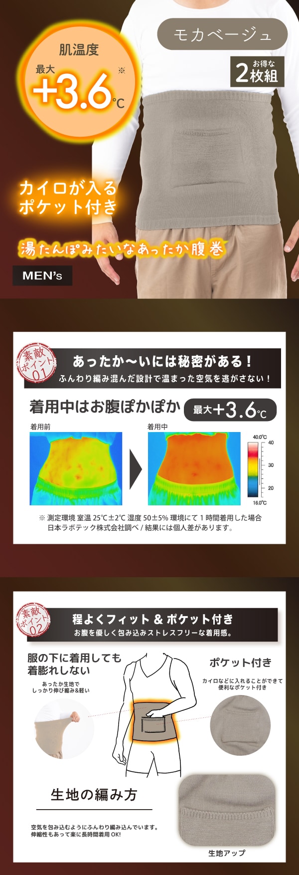 【モカベージュ/2枚組】湯たんぽみたいなポケット付きメンズ腹巻 | あったか繊維と特殊着圧でお腹をしっかり温める