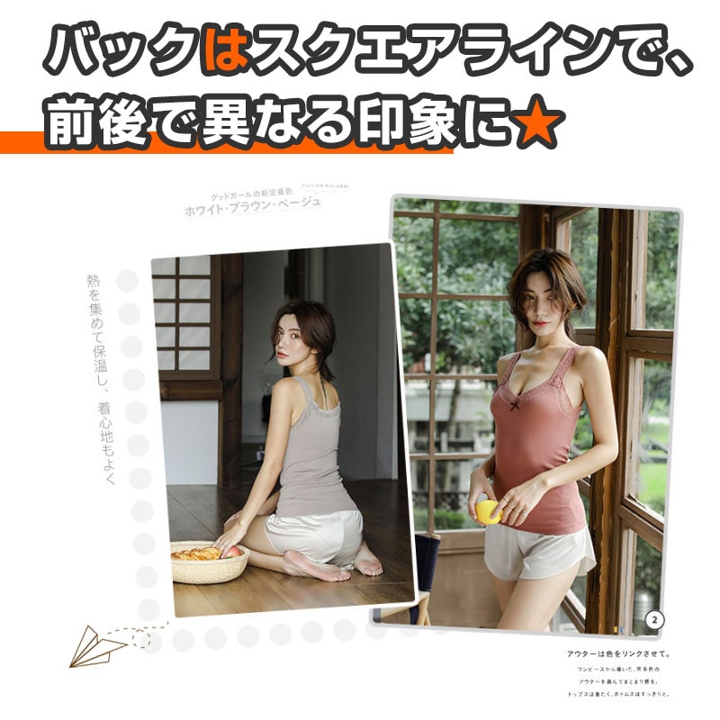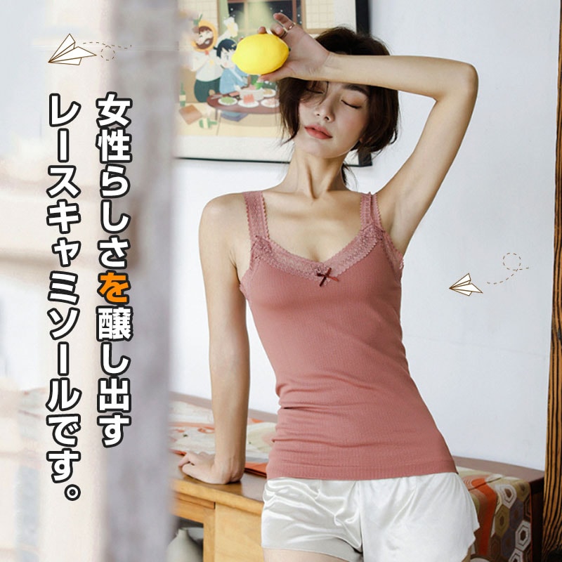 女性らしさを醸し出すレースキャミソールです。胸元や肩のレースでフェミニンな感じになります!
