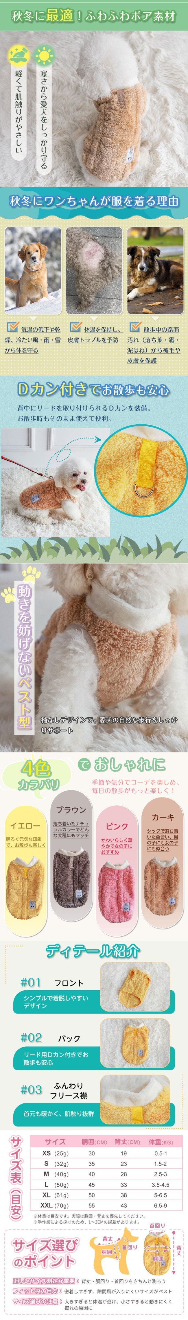【カーキ/Sサイズ】中小型犬用ふわふわボア防寒ウェア | 軽くて暖かいふわふわボア素材のベストタイプ!