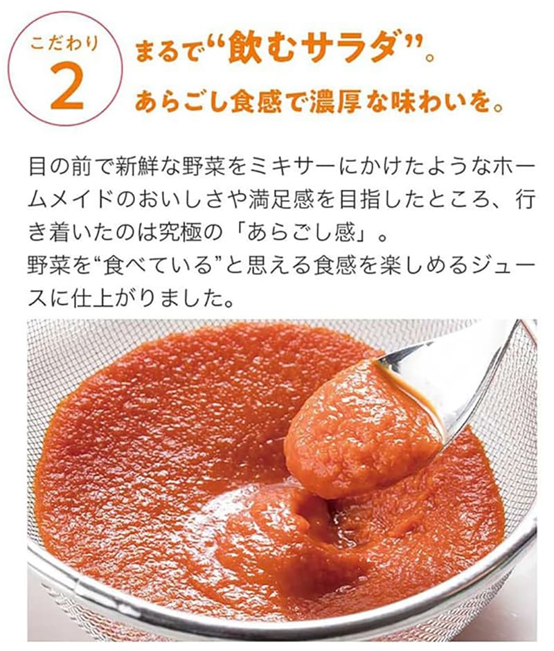 新鮮な野菜をミキサーにかけたような、つぶつぶ感のある飲み心地が特徴で、濃厚な味わい、飲みごたえが楽しめます。