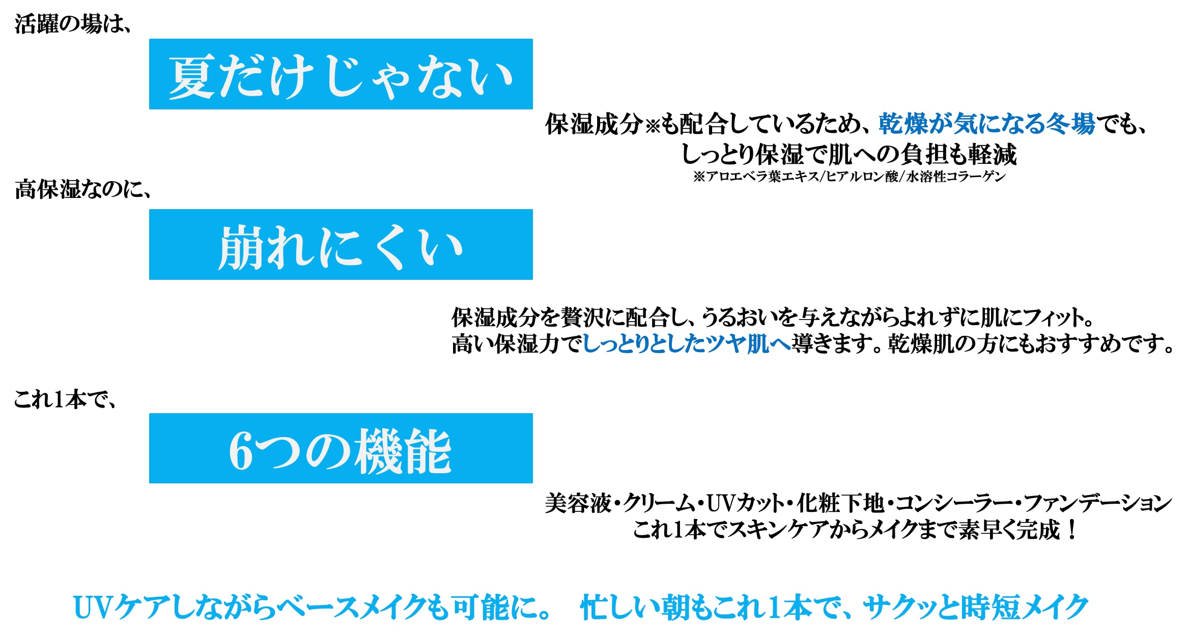 水、シクロペンタシロキサン、シクロメチコン、PEG/PPG-20ジメチコン、メトキシケイヒ酸エチルヘキシル、酸化チタン、酸化亜鉛、マイカ、セスキオレイン酸ソルビタン、リン酸トリオレイル、ジステアルジモニウムヘクトライト、ラノリン、エタノール、ジメチコン、酸化鉄、ステアリン酸グリセリル(SE)、1.2-ヘキサンジオール、ペンテト酸5Na、トコフェロール、BG、アロエベラ葉エキス、スクワラン、キサンタンガム、ヒアルロン酸Na、テトラヘキシルデガン酸アスコルビル、ヒバマタエキス、水溶性コラーゲン、ポリソルベート20、アルブチン、セレブロシド、ステアレス-20、N-ヒドロキシコハク酸イミド、クリシン、パルミトイルトリペプチド-1、パルミトイルトリペプチド-1、パルミトイルテトラペプチド-7、ペンチレングリコール、プロピルパラベン、メチルパラベン、香料