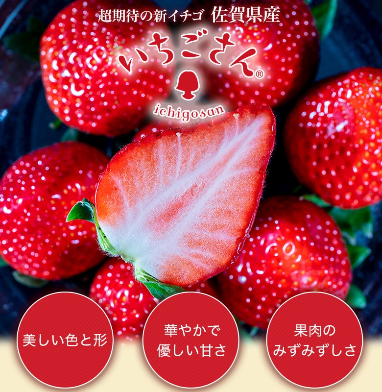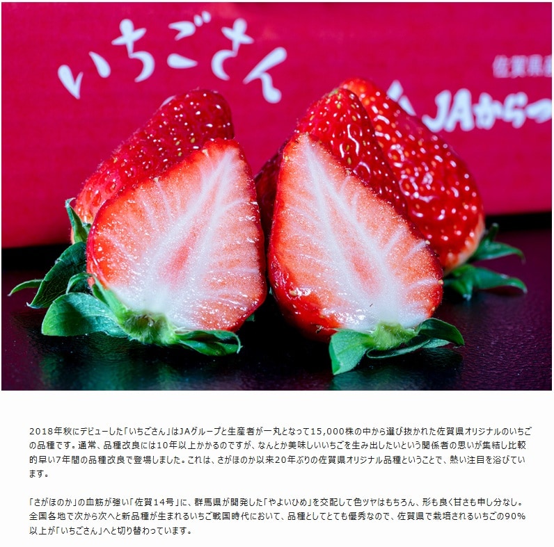 「さがほのか」の血筋が濃く「佐賀14号」に、群馬県が開発した「やよいひめ」を交配して産まれた「佐賀i9号」は、2018年に『いちごさん』の名前でデビュー。「さがほのか」の華やかな甘さと香り、「やよいひめ」の赤色と大玉を引き継ぎました。