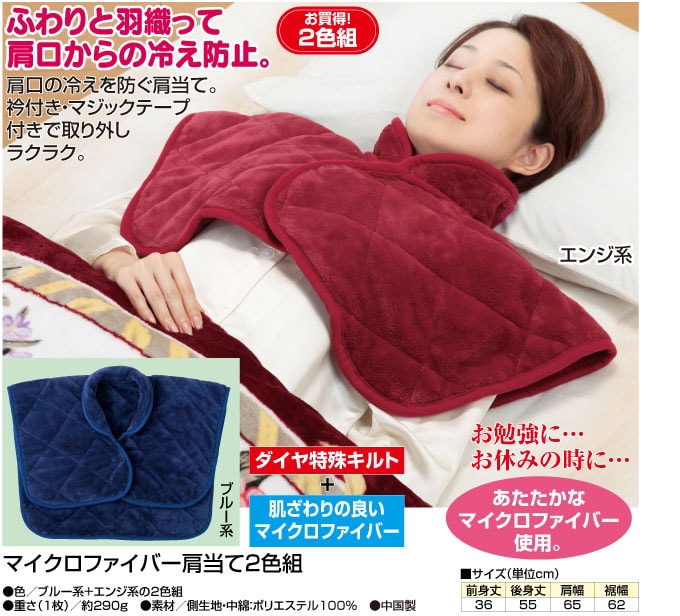 【日替わり数量限定】【2色組/ブルー&エンジ各1枚】マイクロファイバー肩当て | ふわりと羽織って肩口からの冷え防止。衿付き・マジックテープ付きで取り外しラクラク。