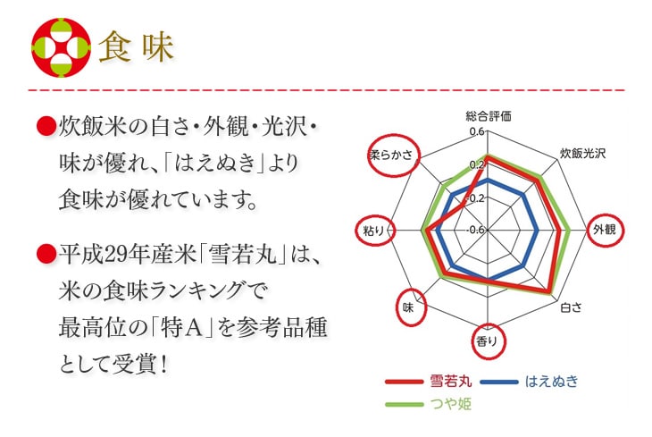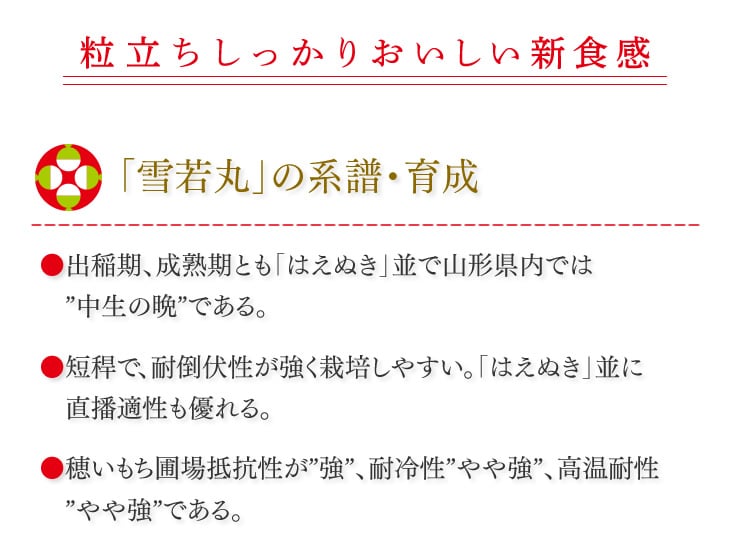 しっかりした粒感と適度な粘りを両立した新食感の「雪若丸」を皆様の食卓へお届けいたします。