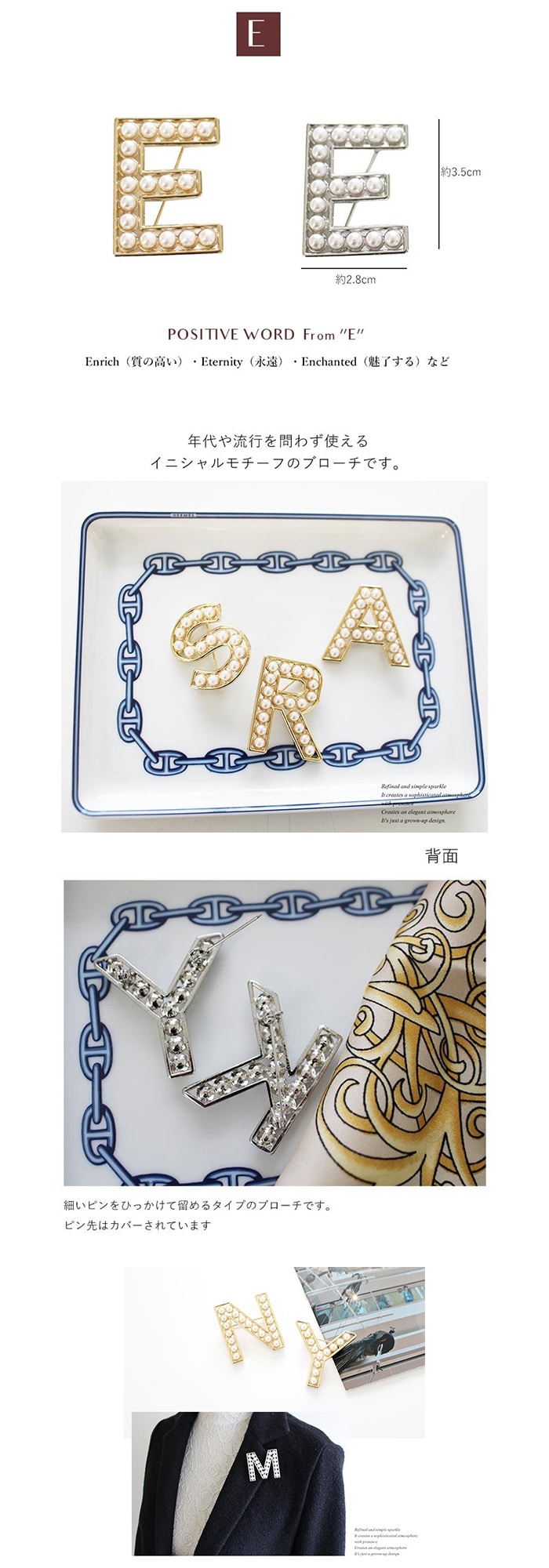 - 【ゴールド】イニシャルブローチ パール アルファベット 【E】