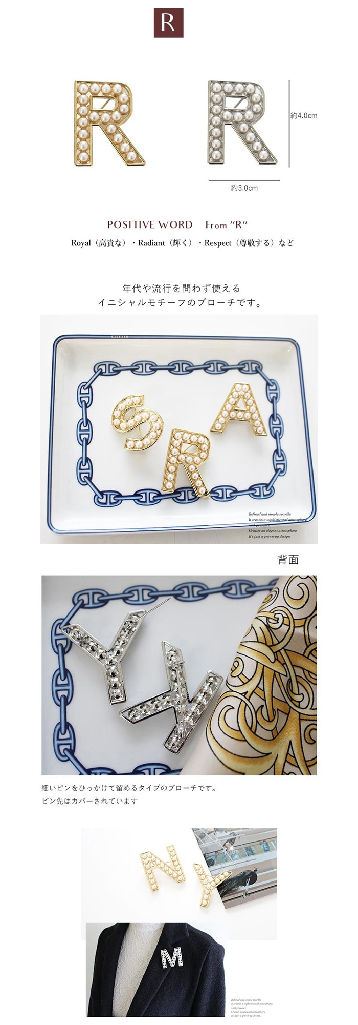 - 【ゴールド】イニシャルブローチ パール アルファベット 【R】