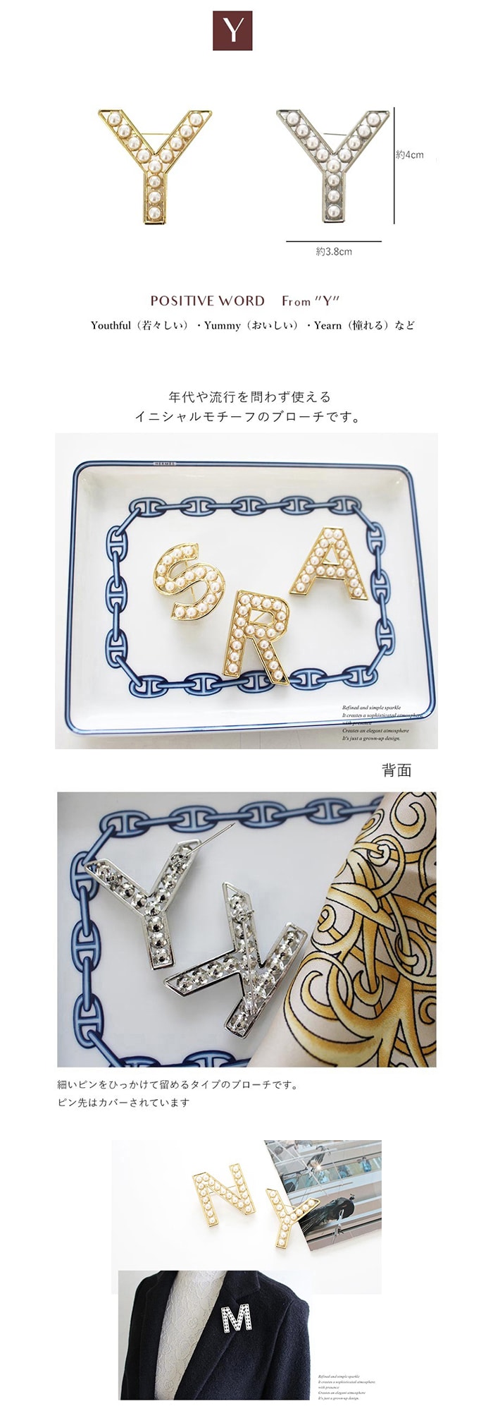 - 【ゴールド】イニシャルブローチ パール アルファベット 【Y】
