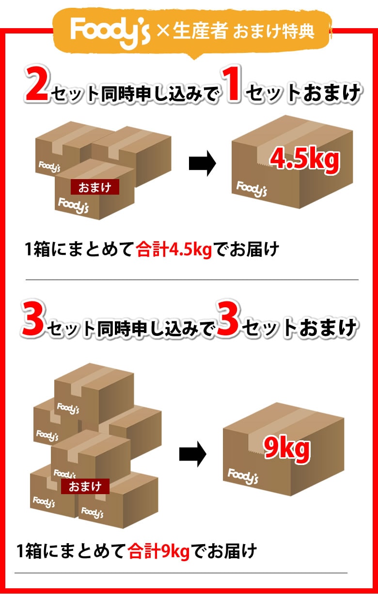 2セット同時申し込みで1セット分おまけ(計4.5kgを1箱にまとめてお届け)