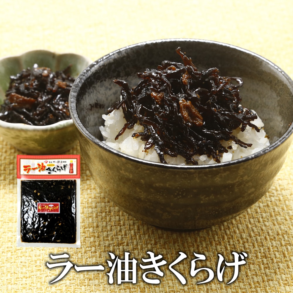 ・ラー油きくらげ…醤油(国内製造)、砂糖、乾燥きくらげ、発酵調味料、ラー油、フライドガーリック、醸造酢、つゆ、風味調味料/ソルビット、調味料(アミノ酸等)、保存料(ソルビン酸K)、酸味料、甘味料(ステビア)、香辛料、(一部に大豆・小麦・ごまを含む)