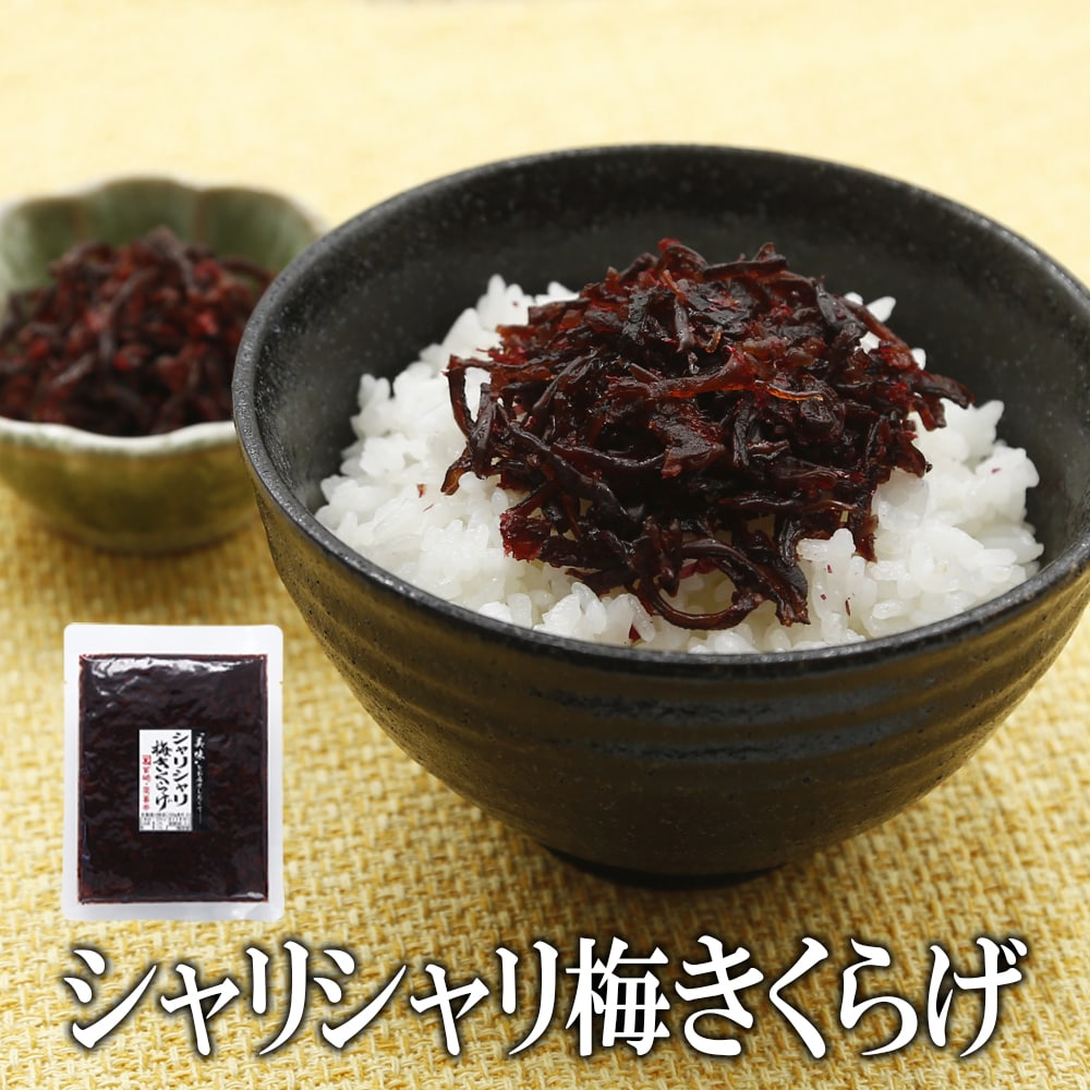 ・シャリシャリ梅きくらげ…醤油(国内製造)、砂糖、調味梅漬(梅、食塩、還元水飴、その他)、乾燥きくらげ、発酵調味料、かつお削り節、醸造酢、風味調味料/ソルビット、調味料(アミノ酸等)、酸味料、酒精、保存料(ソルビン酸K)、着色料(野菜色素、赤106、赤3)、甘味料(甘草、ステビア)、V.B1、(一部に大豆・小麦を含む)