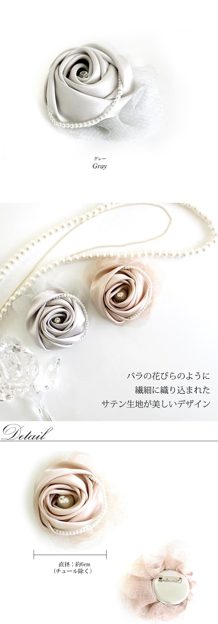 - 【グレー】サテンローズコサージュ パール チュール