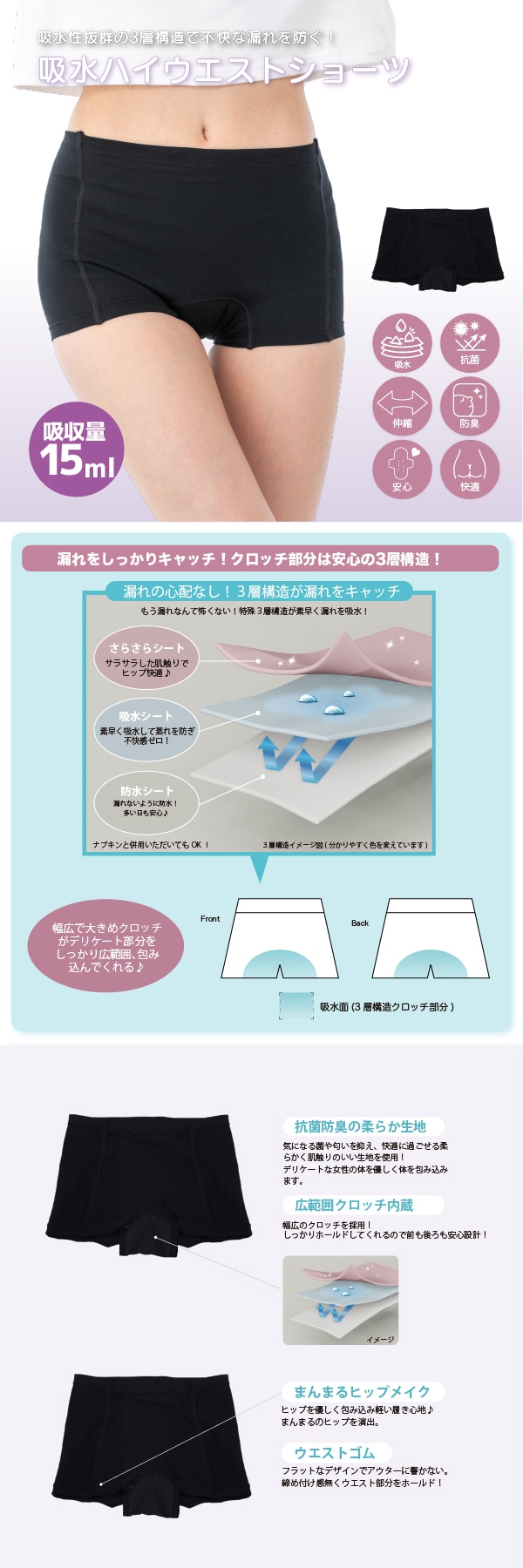 【ブラック/S-M】エアーフィット吸水ハイウエストショーツ | はくたび、安心。漏れを気にしない毎日へ。