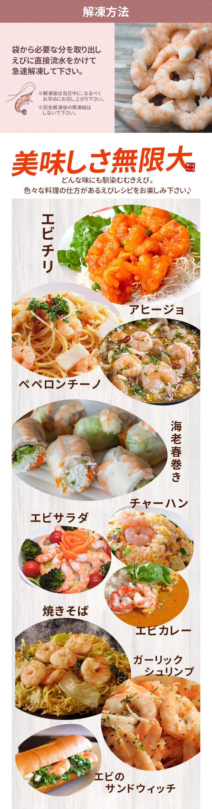 ・お召し上がり方:えびに直接流水をかけ急速解凍して下さい。