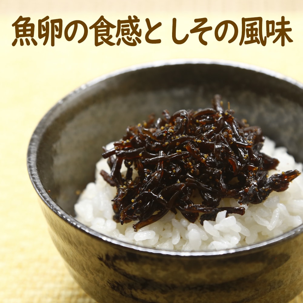 ・原材料/材質/素材:醤油(国内製造)、砂糖、乾燥きくらげ、魚卵、発酵調味料、しその実、醸造酢、風味調味料、食塩/ソルビット、調味料(アミノ酸等)、保存料(ソルビン酸K)、酸味料、甘味料(ステビア)、香料、(一部に大豆・小麦を含む)