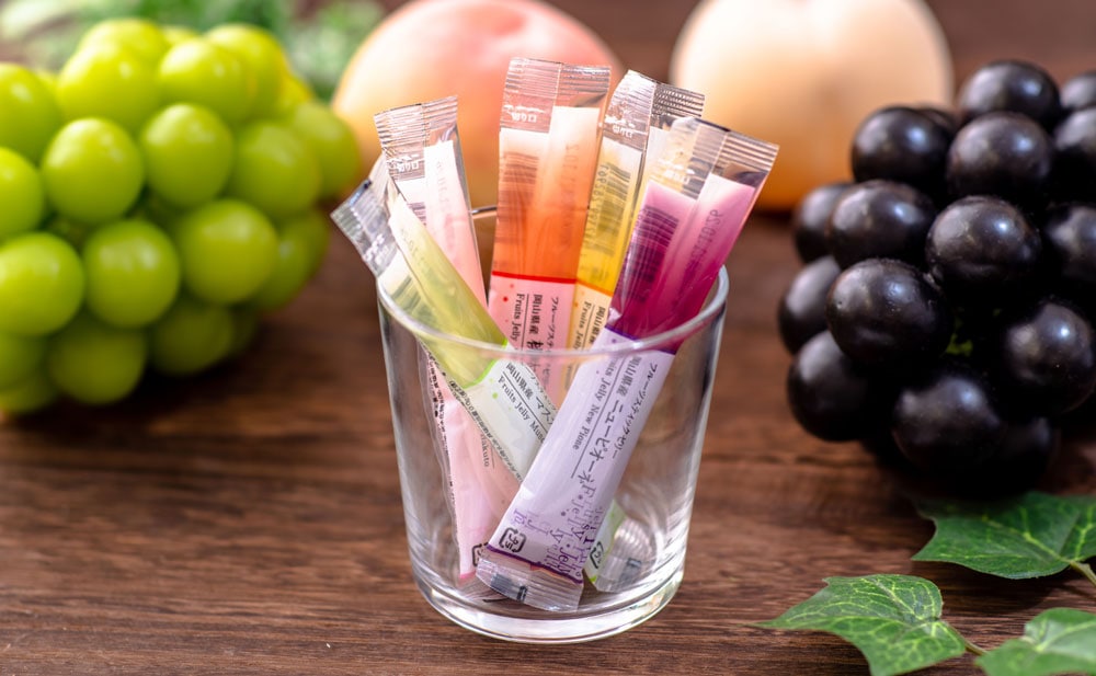 果物のピューレや果汁を使用したフルーツゼリーを食べきりのスティックパウチに詰めました。