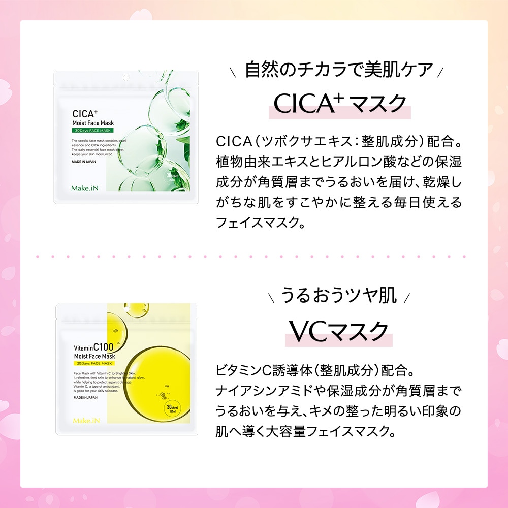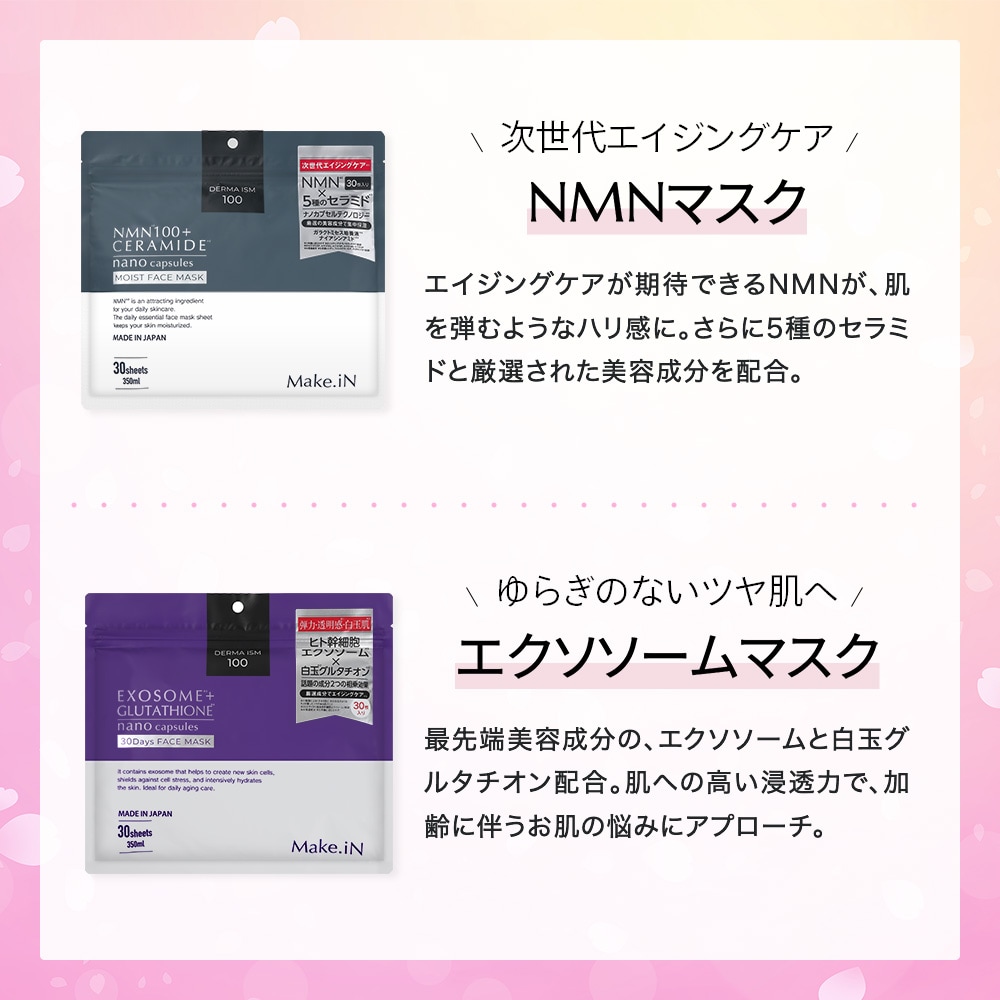 【春限定】Make.iN フェイスマスク6種 お試しスペシャルセット(各30枚入/6袋セット) | CICA+やVC100、注目の美容成分NMNやエクソソーム、グルタチオン配合フェイスマスク