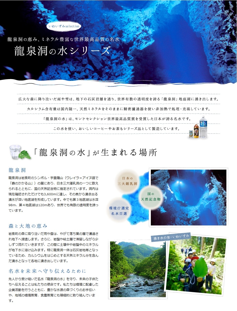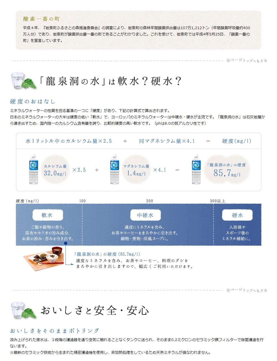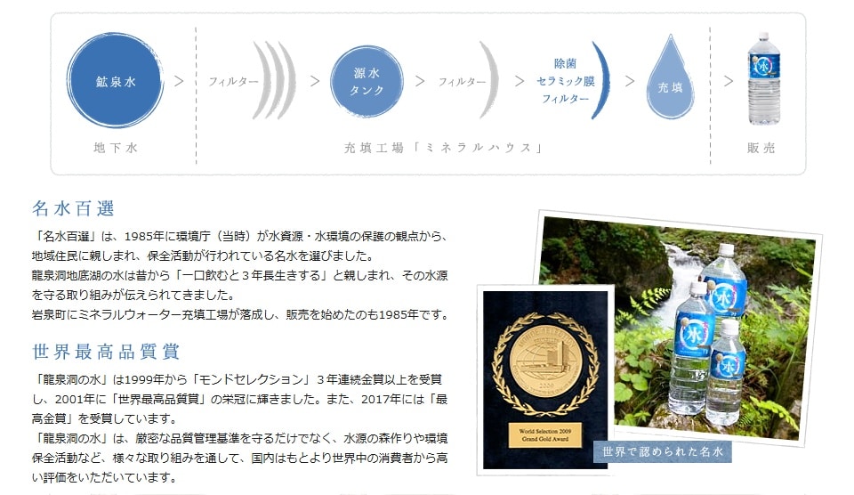 龍泉洞から湧き出た原水をセラミック膜フィルターで濾過し、非加熱充填した「ナチュラルミネラルウォーター」です。国内のミネラルウォーターの中ではカルシウム含有量が多く、比較的硬度の高い軟水です。
