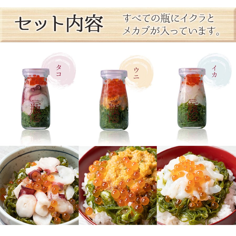 - 【瓶ドン3本セット】たこ・ウニ・いか 各1本 ご飯にのせるだけで絶品海鮮丼!