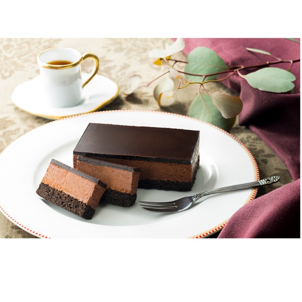 ビターなスポンジの上に濃厚で口溶けの良いチョコレートムースを乗せました。ベルギー製造のチョコレートをふんだんに使用しました。口解けが濃厚でお口の中でカカオの味と風味がまろやかに広がります。