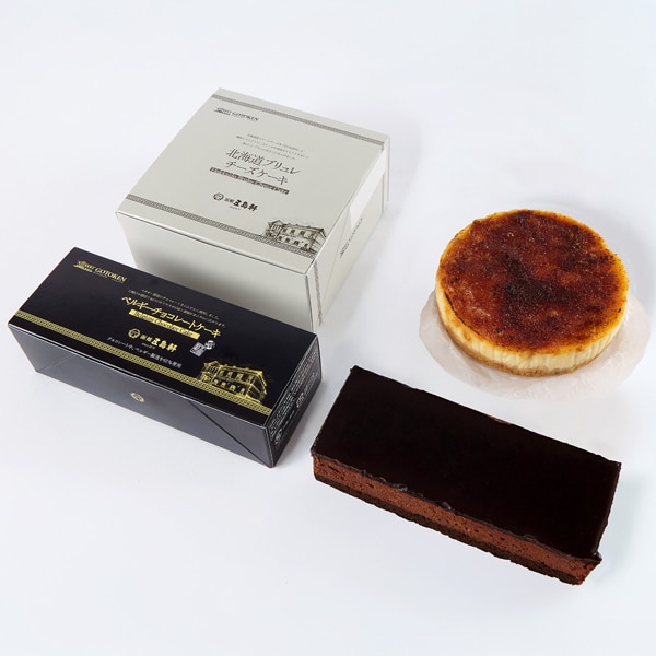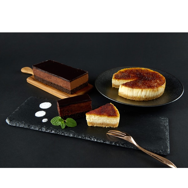 北海道産クリームチーズを使用し、しっとりなめらかな食感に仕上げ、ほろ苦いキャラメリゼの甘さとチーズの香りが絶妙な北海道ブリュレチーズケーキと、ビターなスポンジの上に濃厚で口溶けの良いチョコレートムースを乗せ、ベルギー製造のチョコレートを使用したチョコレートケーキのセットです。